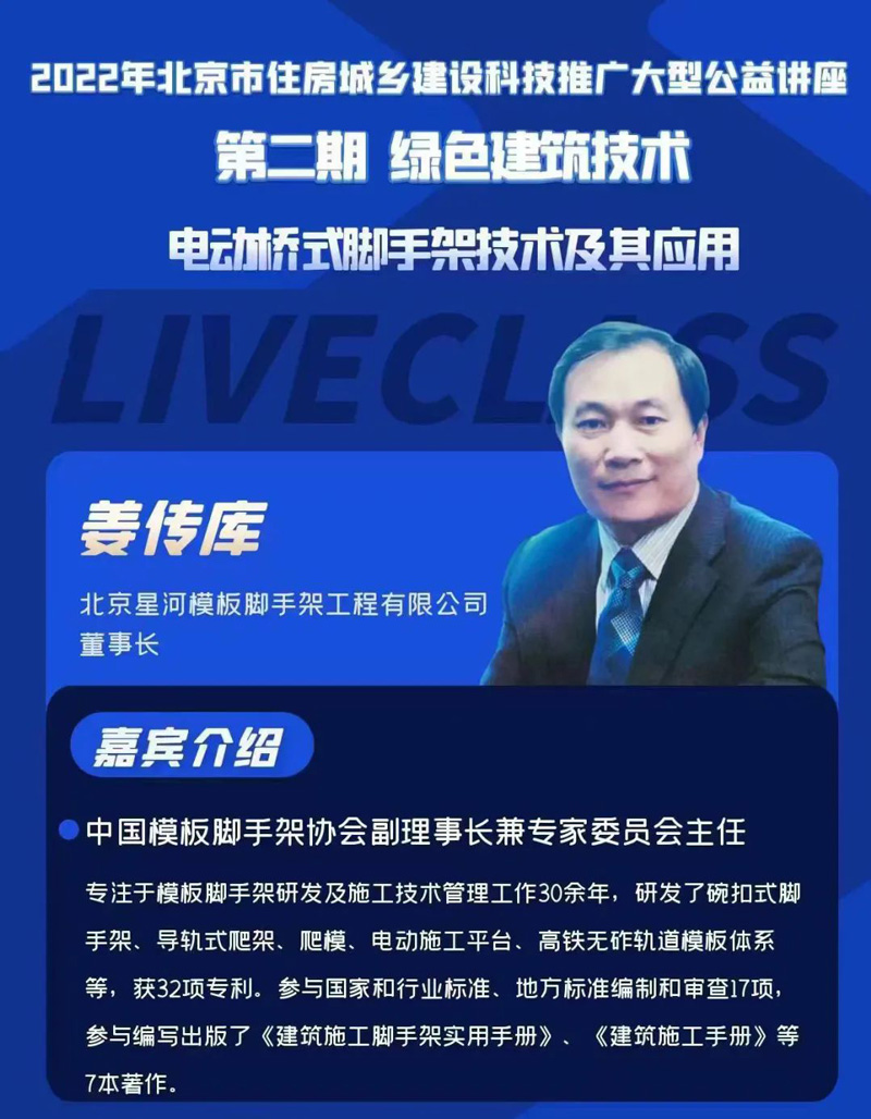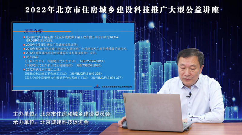 協(xié)會副理事長兼專家委員會主任、北京星河模架工程有限公司董事長姜傳庫,近日做客2022年北京市住房城鄉(xiāng)建設(shè)科技推廣大型公益講座,主講《電動橋式腳手架技術(shù)及其應(yīng)用》。