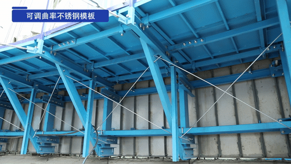 4、首次在滑模中應(yīng)用不銹鋼模板平臺(tái)創(chuàng)新性地采用可調(diào)曲率高強(qiáng)不銹鋼模板體系替代傳統(tǒng)小鋼模板,改變“以直代曲”的施工工藝,同時(shí)可實(shí)現(xiàn)弧形不銹鋼模板地高效周轉(zhuǎn)。
